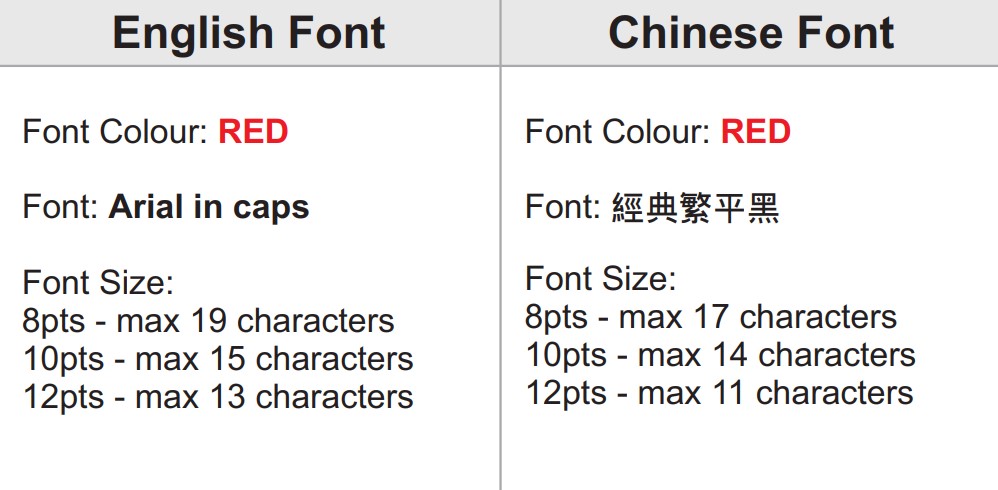 Numbering: 4 – 7 digits (RED colour) **The last digit must always begin with 1 Example: 0001, 00101, 000501